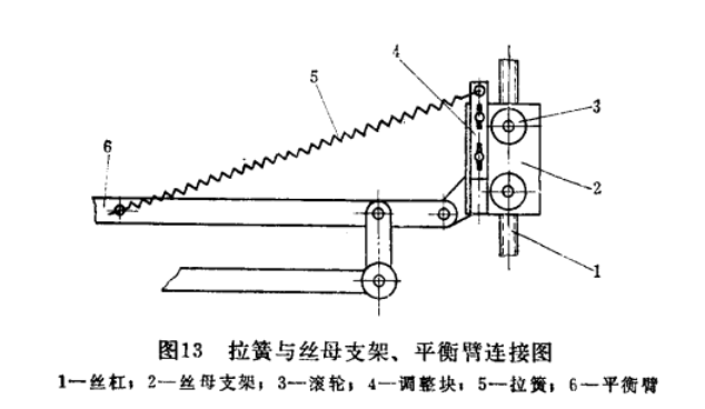在保證拉簧質(zhì)量的情況下,為使平衡吊在空載時得到更好的平衡效果,應(yīng)在絲母支架的上端裝一個可上下調(diào)整的調(diào)整塊,以調(diào)節(jié)彈簧的拉力。