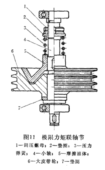 大皮帶輪6以動配合裝在小軸4上。摩擦錐體5用鍵與小軸連接,但能在小軸上作軸向移動。壓力彈簧3的壓力大小,靠調(diào)壓螺母1來調(diào)整。動力的傳遞是通過壓力彈簧將摩擦錐體壓緊在大皮帶輪的錐面上,靠摩擦力矩將動力由大皮帶輪傳遞到小軸上。當(dāng)起吊重量超過額定負(fù)載時,磨擦面就會打滑,保證平衡吊各零件不致?lián)p壞,起到安全保護(hù)作用。同時也能使平衡吊的起升和停車比較平穩(wěn)。但是應(yīng)該注意,在使用中不可將壓力彈簧調(diào)得過緊,否則將失去作用。
